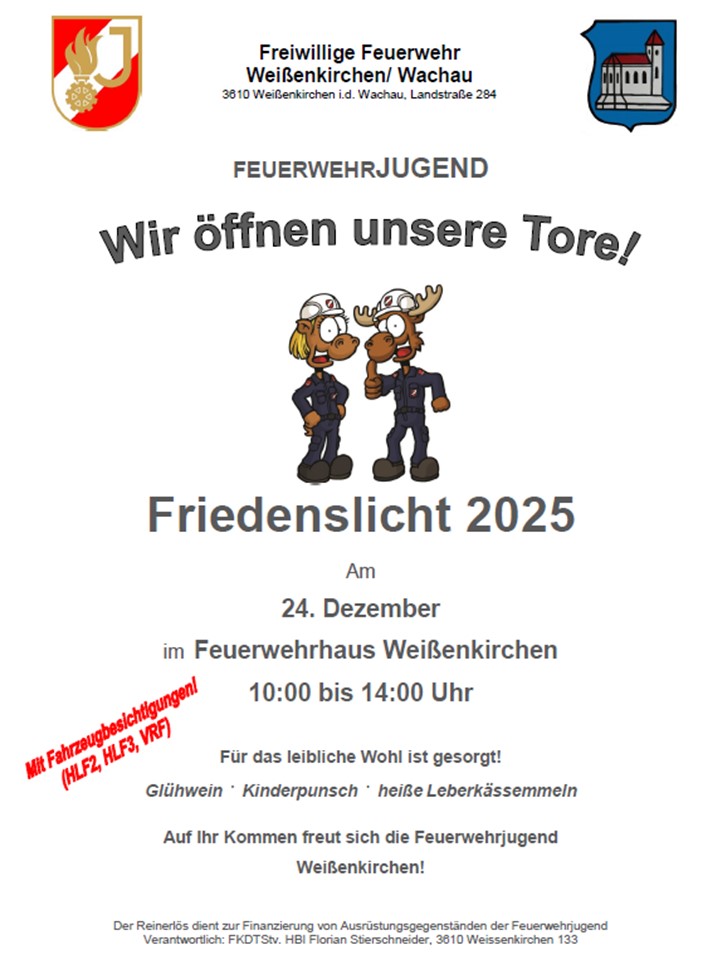 Die Feuerwehrjugend der FF Weißenkirchen ladet sehr herzlich zur Friedenslichtaktion in das Feuerwehrhaus Weißenkirchen!
